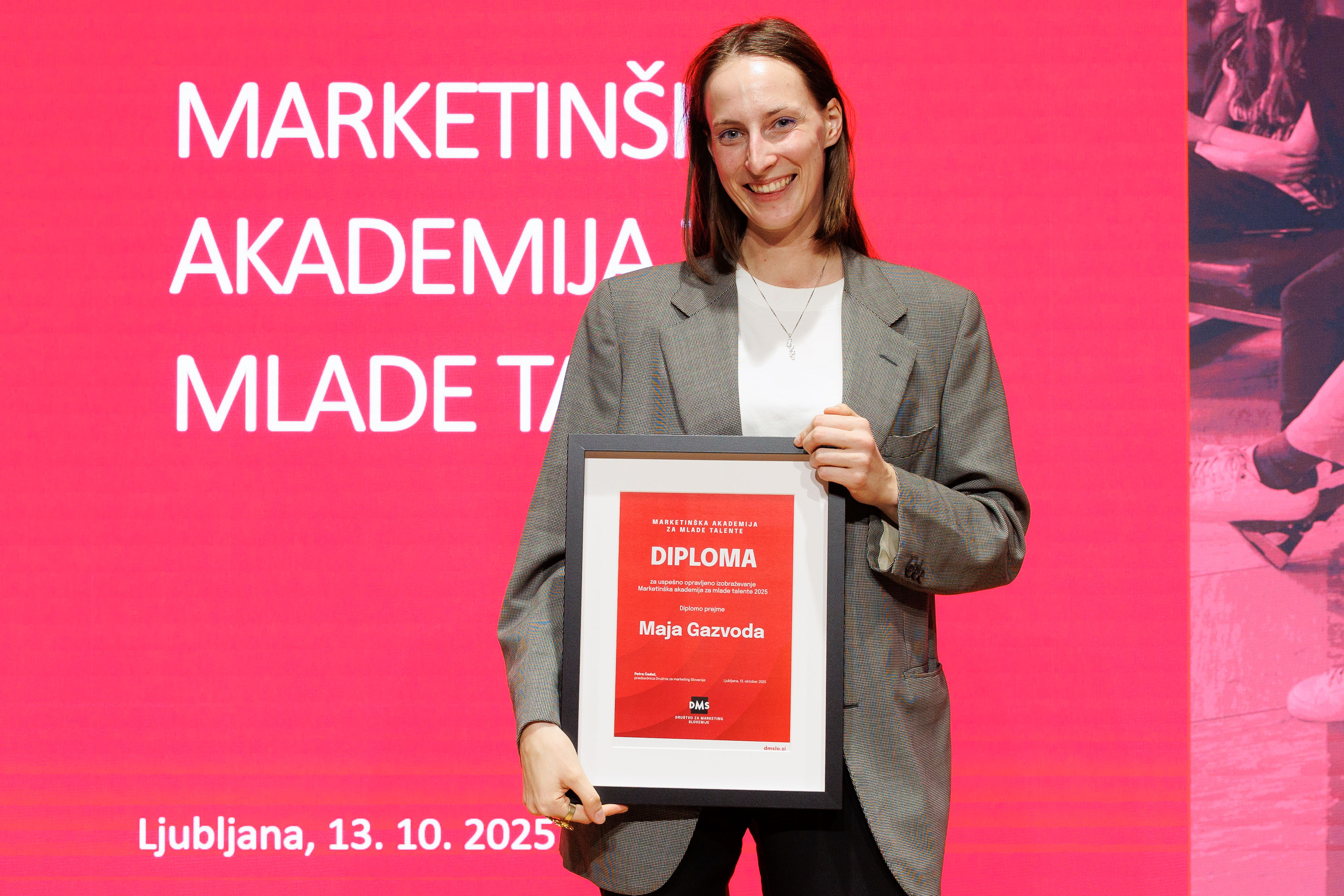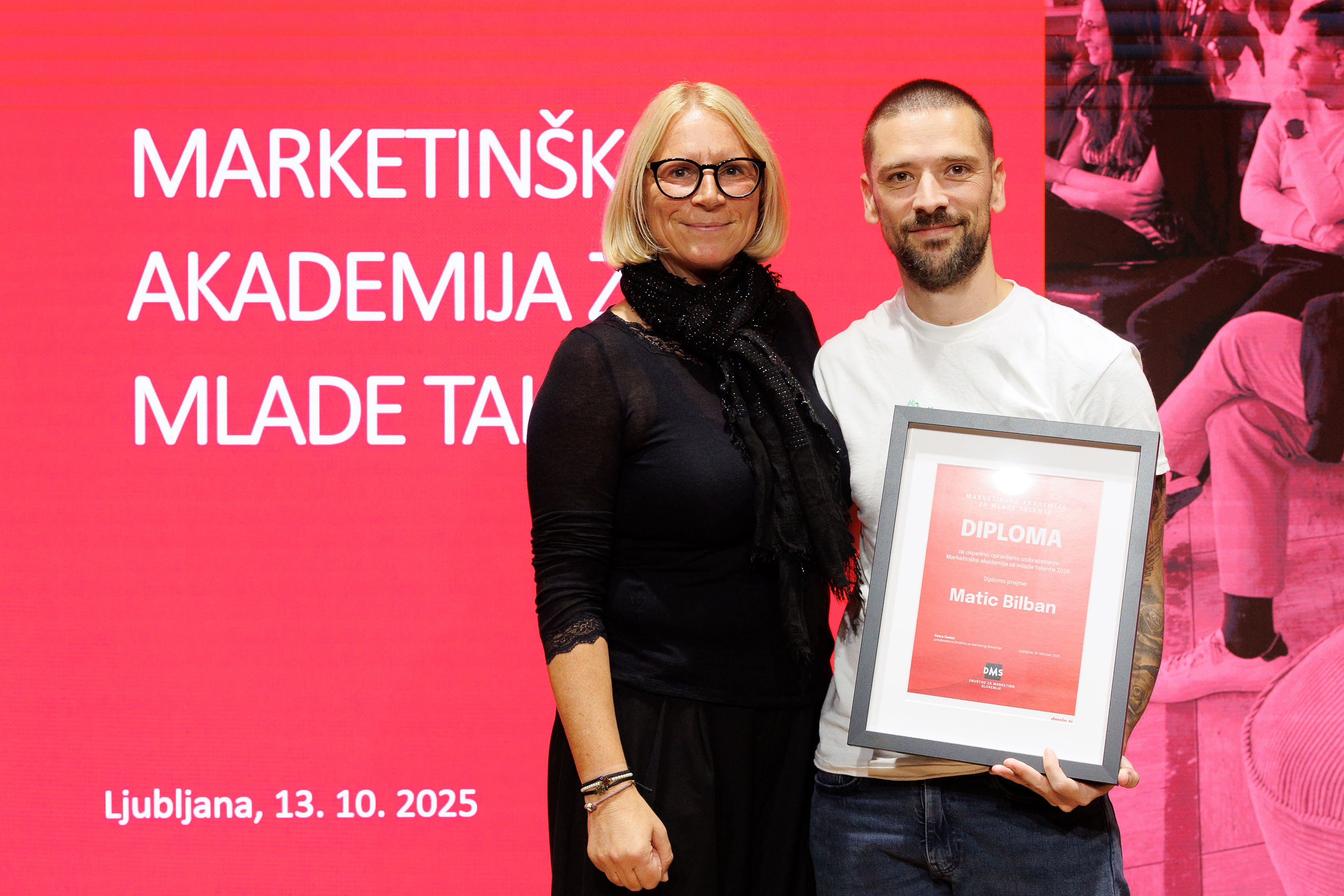 Podelitev diplom je potekala v toplem in navdihujočem vzdušju, kjer je Tanja Kavran, izvršna direktorica Društva za marketing Slovenije, čestitala udeležencem in poudarila pomen radovednosti, poguma in stalnega učenja.