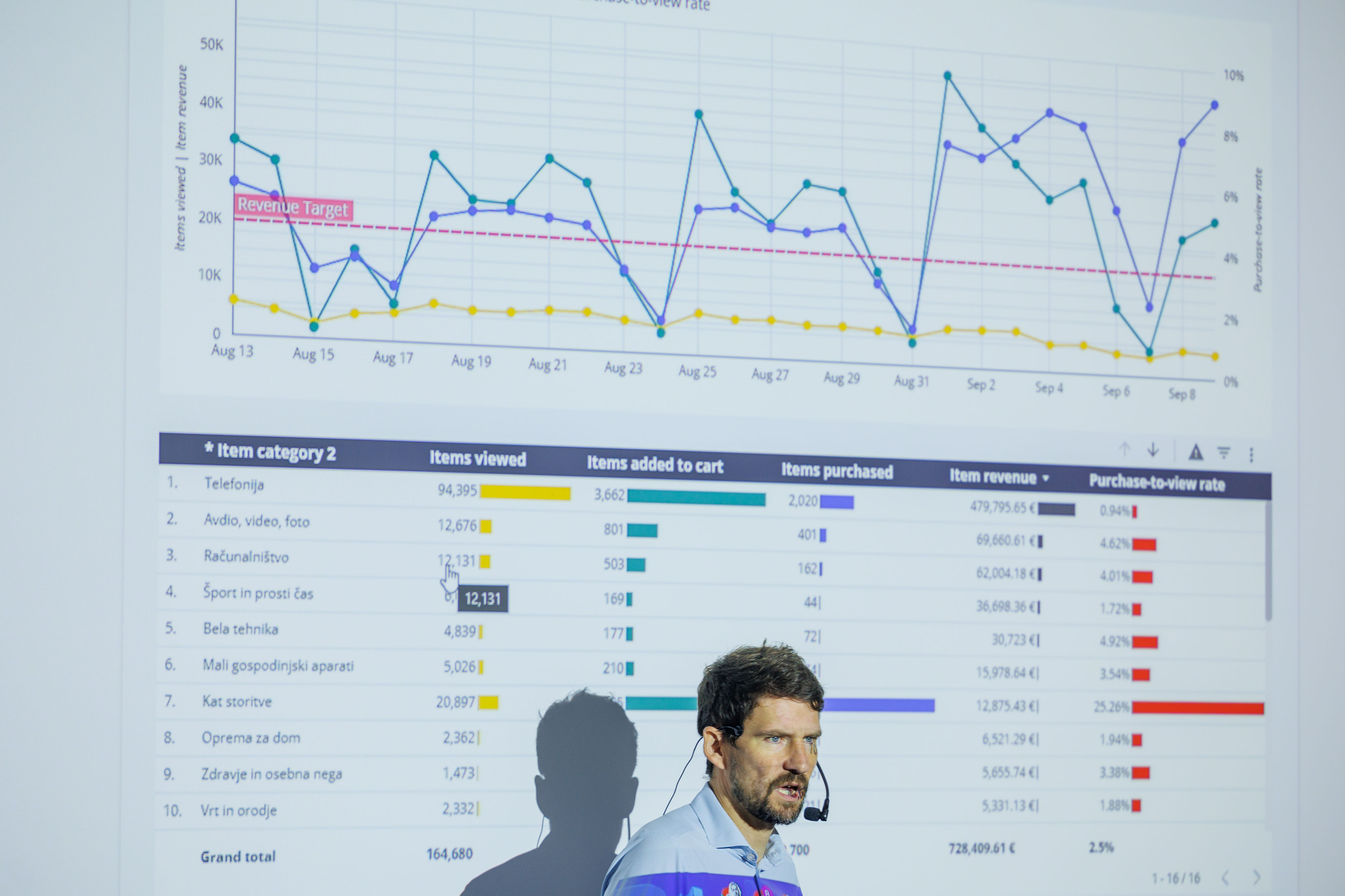 Boštjan Hozjan je predstavil tudi primer analitike za spletno trgovino, kar je mogoče nastaviti s pomočjo sklopa »enhanced ecommerce«. Poročilo »Purchase journey« nam prikaže lijak, celotno nakupno pot kupcev in kaj se dogaja v posamezni fazi. Poročilo »Check-out journey« nam pokaže celotno pot od trenutka, ko je kupec zaključil z dodajanjem izdelkov v košarico oz. ko je začel z zaključkom nakupa, do konca izvedbe naročila in plačila. To sta dva lijaka, ki ju je po besedah Boštjana Hozjana dobro opazovati, saj je treba nujno raziskati morebitne velike padce iz ene faze v drugo.